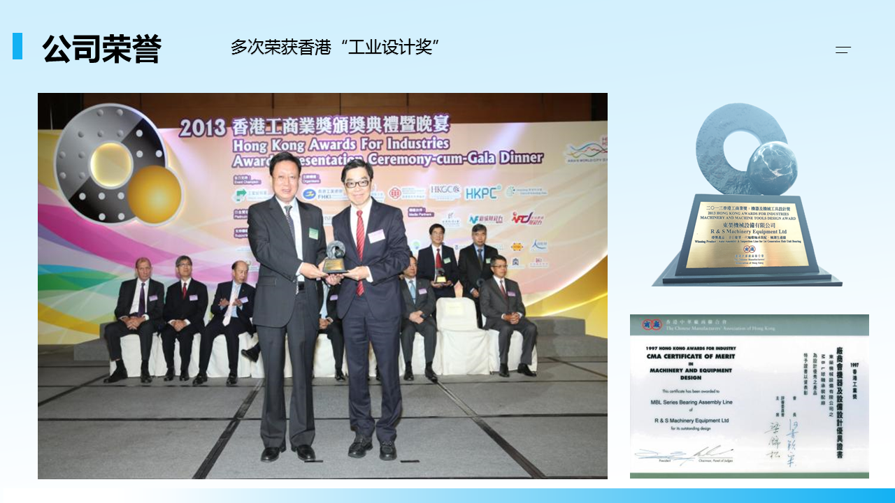 东荣机械设备有限公司自一九九零年在香港成立以来,以发展和创新为己任,以“研究、发展、服务”为宗旨。公司专注于轴承自动化装配及检测设备的设计研发与生产销售三十余年,有着丰富的轴承自动化设备研发设计及生产制造经验。分别在广州、上海成立:广州东荣轴承设备有限公司、炫荣工业自动化设备(上海)有限公司,已形成以香港、广州、上海为中心的研发、制造、服务一体化运行模式,并充分利用三地独特的区域优势,不断扩展产品范围,提高整体实力,公司产品销往全球百余家轴承制造企业,包括多个全球知名轴承集团公司及区域知名轴承企业。已发展为行业内专业可靠的自动化设备供货商。公司多次荣获香港“总督工业奖”、香港“工业设计奖”等殊荣,并分别在2015年、2018年、2021年荣获国家级“高新技术企业”、2023年荣获“创新型中小企业” 、2024年荣获“专精特新中小企业”。